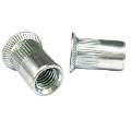 Гайка-заклепка – метиз, состоящий из нескольких частей, основная из которых – головка, реализованная в виде бортика, представленная в плоском, потайном и полупотайном вариантах. Средняя часть приспособления немного тоньше, так как подвергается деформации при установке, а нижняя дополнена внутренней резьбой.